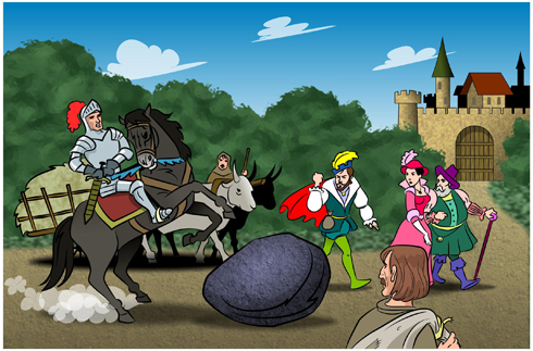 One night while everyone else slept, he placed a large stone in the road that went past the palace. Then he hid behind a hedge and waited to see what would happen.