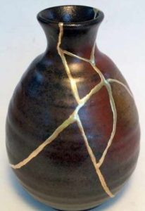 The Japanese art of Kintsugi repairs broken pottery with lacquer mixed with gold. It’s also a philosophy that treats breakage and repair as part of the history of the object.